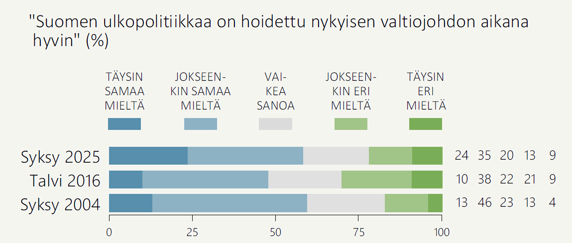 Metelinen, S. (2025). Suomen ulkopolitiikan hoitoon ollaan tyytyväisiä, mutta hallituksen toiminta jättää toivomisen varaa, EVA Artikkeli.