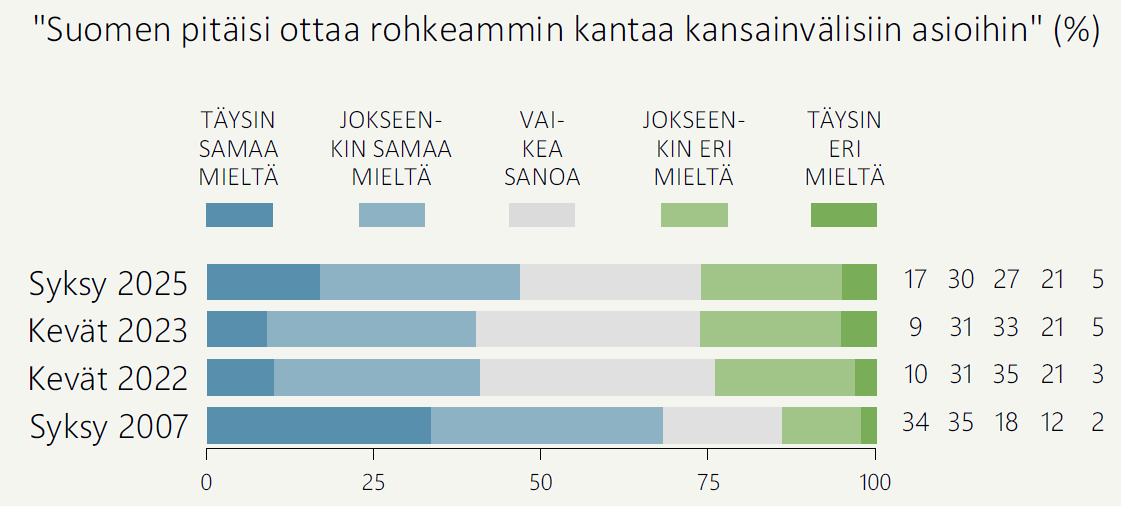 Vuosien 2022 ja 2023 mittauksissa korostui Suomen oma turvallisuus Suomen Nato-prosessin ollessa vielä kesken, mutta aiempi vuoden 2007 mittaus osoittaa, että ennen selvä enemmistö on ollut rohkeamman kantaa ottamisen puolella. Nykynäkemykset kuvastavat maailmanpolitiikan epävarmaa tilannetta, mutta alleviivaavat myös perustavanlaatuista näkemyseroa oikeistolaisesti ja vasemmistolaisesti ajattelevien välillä.