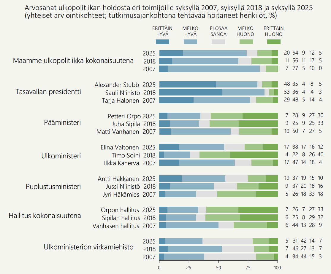 Suomalaisten näkemykset ulkopolitiikan hoitamisesta syksyllä 2025 kuvaavat tilannetta, jossa Alexander Stubb on ehtinyt toimia tasavallan presidenttinä reilut puolitoista vuotta. Ulkopolitiikan johtamisen kannalta merkitystä on presidentin lisäksi ennen kaikkea neljällä ulkopolitiikan avainministerillä, jotka ovat tällä hetkellä pääministeri Petteri Orpo, ulkoministeri Elina Valtonen puolustusministeri Antti Häkkänen sekä ulkomaankauppa- ja kehitysministeri Ville Tavio.