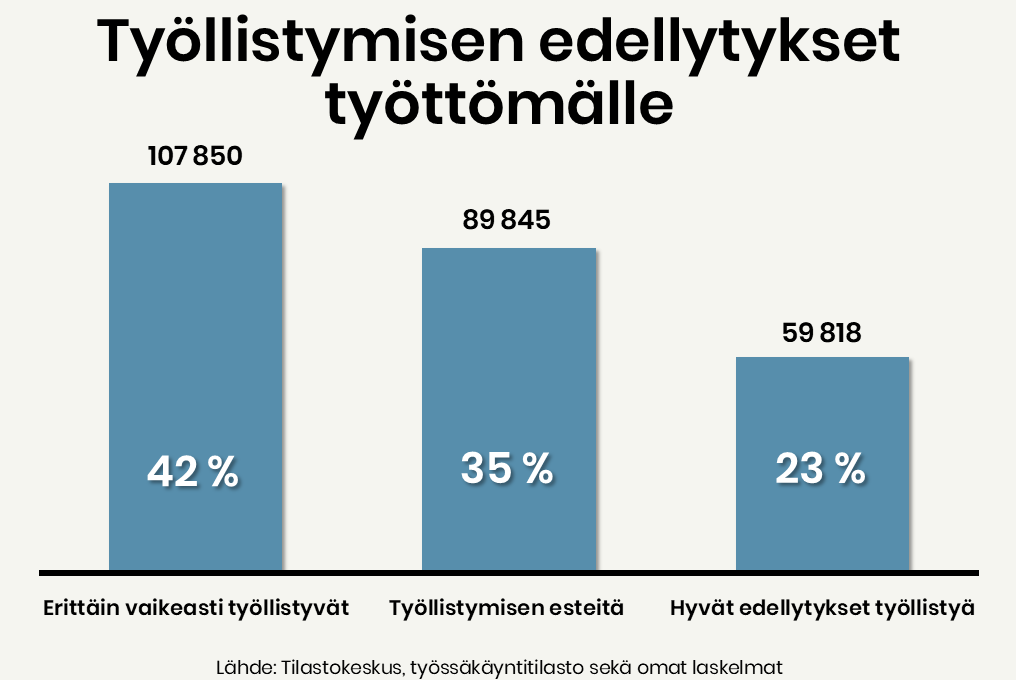 - Vain 23 prosenttia työttömistä on helposti työllistettäviä. Erittäin vaikeasti työllistyviä on 42 prosenttia ja työllistymisen esteitä omaavia on 35 prosenttia.