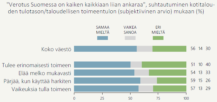 Verotuksen tasoa kohtuullisena tai liian matalana pitävät painottuvat pääosin erinomaisesti toimeentuleviin suomalaisiin. Vaikka erinomaisesti tuloillaan toimeentulevien ryhmästäkin puolet (51 %) pitää verotusta Suomessa kaiken kaikkiaan liian ankarana, 40 prosenttia on asiasta eri mieltä. Kantojen jakautumista saattavat selittää erot poliittisissa näkemyksissä. [4]