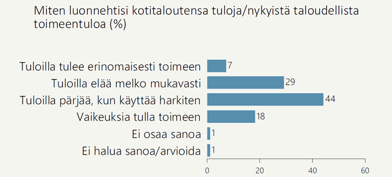 EVAn syksyn 2025 Arvo- ja asennetutkimuksen mukaan suomalaisista 44 prosenttia luonnehtii kotitaloutensa pärjäävän tuloillaan, kun käyttää niitä harkiten (Liitekuvio 1). Erinomaisesti tai melko mukavasti toimeentulevassa kotitaloudessa elää reilu kolmannes (36 %), ja 18 prosenttia suomalaisista kokee kotitaloudessaan vaikeuksia tulla toimeen.