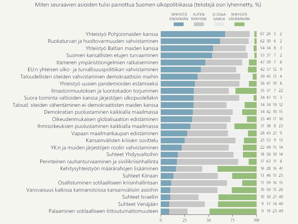 Vuoden 2023 mittauksesta lähtien suomalaisten toiveet ulkopolitiikalta ovat suuntautuneet koko ajan enemmän kokonaisvaltaiseen lähialueiden turvallisuuteen Itämeren muututtua Suomen ja Ruotsin Nato-jäsenyyksien myötä Naton sisämereksi. [4]