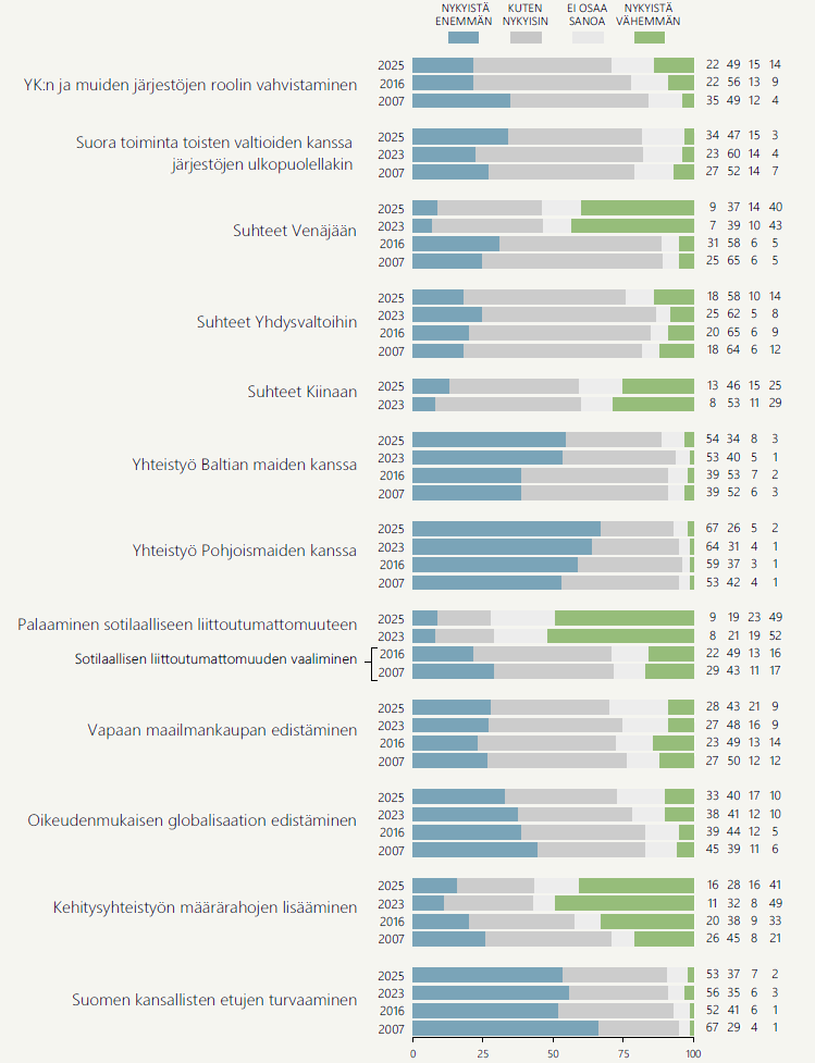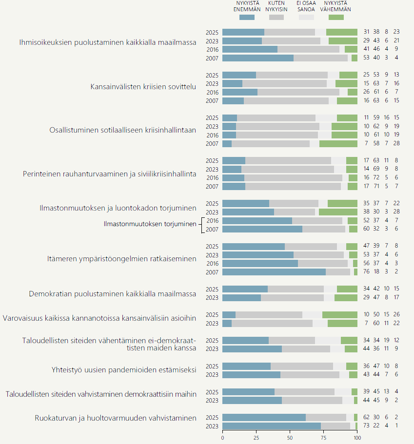 Suomalaisten toivomat painotukset ulkopolitiikalta ovat muuttuneet selvästi viimeisten parinkymmenen vuoden mittaan. Vielä vuonna 2007 selvällä ykkössijalla ulkopolitiikalta enemmän painotusta toivottavien asioiden listalla oli Itämeren ympäristöongelmien ratkaiseminen (ks. Liitekuvio 1). Asia on selvästi edelleen tärkeä suomalaisille, mutta enää 47 prosenttia toivoo asialle nykyistä enemmän painotusta, mikä on 29 prosenttiyksikköä vähemmän kuin 18 vuotta aiemmin. 39 prosentin mielestä riittää, että Itämeren asiaa painotettaisiin kuten nykyisinkin.