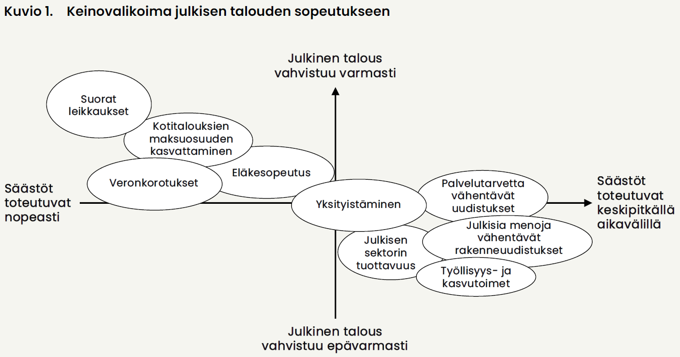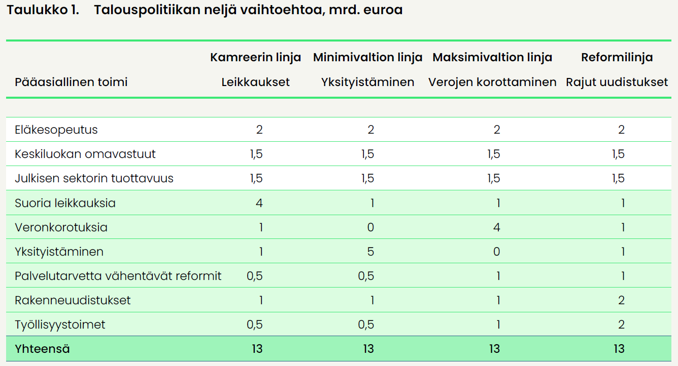 - 13 miljardin sopeutus on mahdollista neljän vaihtoehtoisen talouspoliittisen linjan pohjalta. Sopeutuksessa voivat painottua yksityistämiset (minimivaltio), leikkaukset (kamreeri), veronkorotukset (maksimivaltio) tai rajut uudistukset (reformisti).