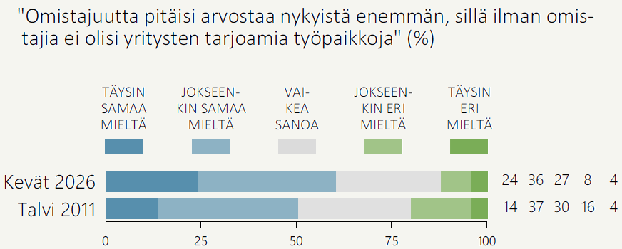 Omistajuudelle suurempaa arvostusta vaativien osuus on noussut yhdeksän prosenttiyksikköä talven 2011 mittauksesta, jolloin sama kysymys esitettiin edellisen kerran. Eri mieltä omistajuuden arvostuksesta olevien osuus on vähentynyt lähes saman verran (8 %-yks.).