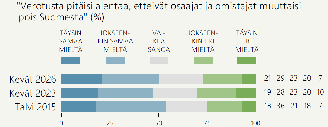 Suomalaisten näkemykset verotuksen alentamisesta osaajien ja omistajien pitämiseksi maassa ovat pysytelleet samalla tasolla viimeisen vuosikymmenen ajan. Edelliseen, kevään 2023 mittaukseen nähden toiveet veronalennuksista ovat hieman voimistuneet.