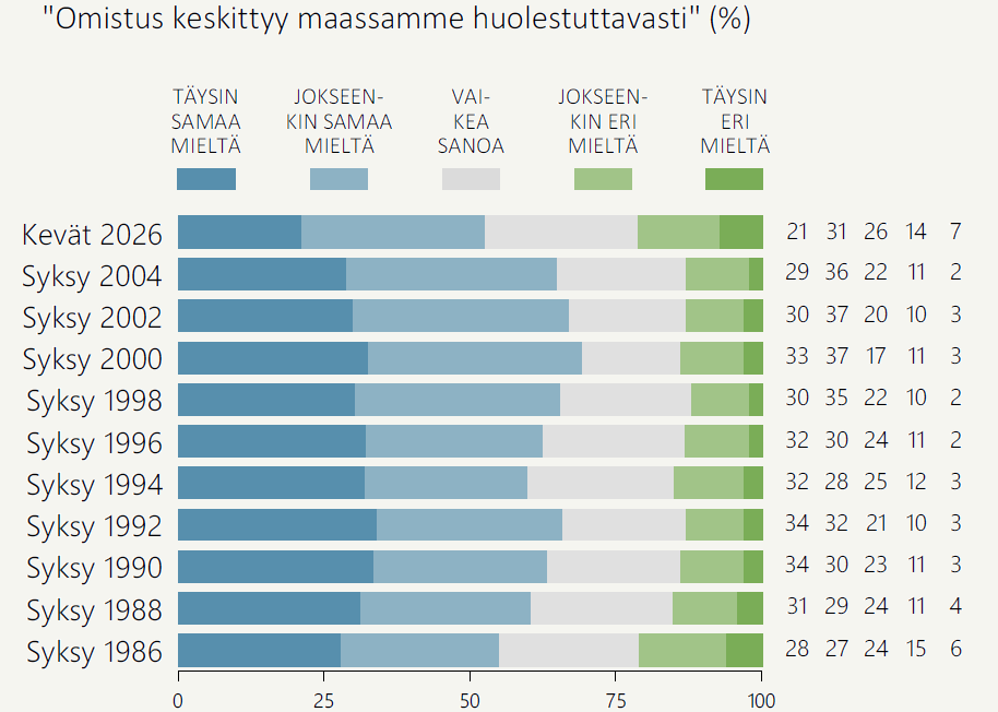 Huoli omistuksen keskittymisestä on edelleen melko laajaa, mutta se on vähentynyt selvästi edeltäneistä vuosikymmenistä. Vielä 2000-luvun alussa jopa kaksi kolmesta suomalaisesta ajatteli omistuksen keskittyvän maassamme huolestuttavasti. Huoli on lientynyt edellisestä, syksyn 2004 mittauksesta 13 prosenttiyksikköä. Iäkkäämmät kansalaiset ovat huolissaan omistuksen keskittymisestä nuoria useammin ja matalasti koulutetut korkeakoulutettuja useammin (ks. Kuvioliite).