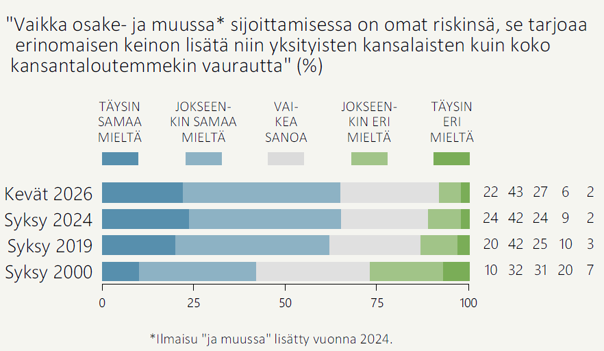 Kaksi kolmesta (65 %) suomalaisesta ajattelee, että vaikka osake- ja muussa sijoittamisessa on omat riskinsä, se tarjoaa erinomaisen keinon lisätä niin yksityisten kansalaisten kuin koko kansantaloutemmekin vaurautta. Toista mieltä on vain 8 prosenttia suomalaisista, ja 27 prosenttia jättää ottamatta kantaa kysymykseen.